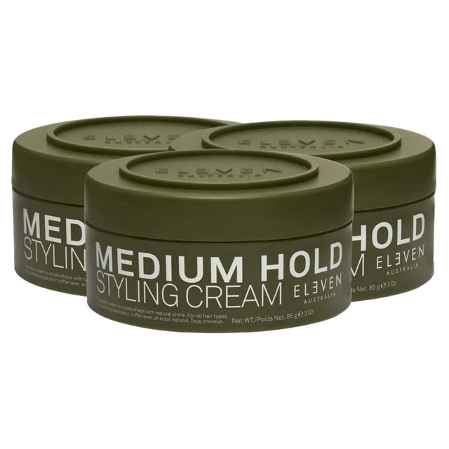 This bundle includes 3 x ELEVEN Australia Medium Hold Styling Cream. This cream creates shape with a natural shine. This pliable styling cream is packed with carnauba wax to nourish the hair and provide a medium hold. It smooths hair and retains moisture, providing hold and control without weighing the hair down. The result is healthy, manageable hair with a natural shine.