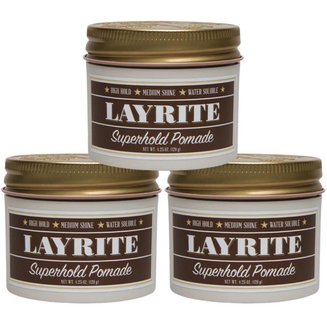 This bundle contains 3 x Layrite Superhold Pomade. This Pomade is ideal if you have hard-to-control hair that you want to style. It is water-soluble, conditioning the hair and allowing you to easily grip it into place. With this product, you'll get an extreme hold to achieve the most challenging styles with a medium shine.