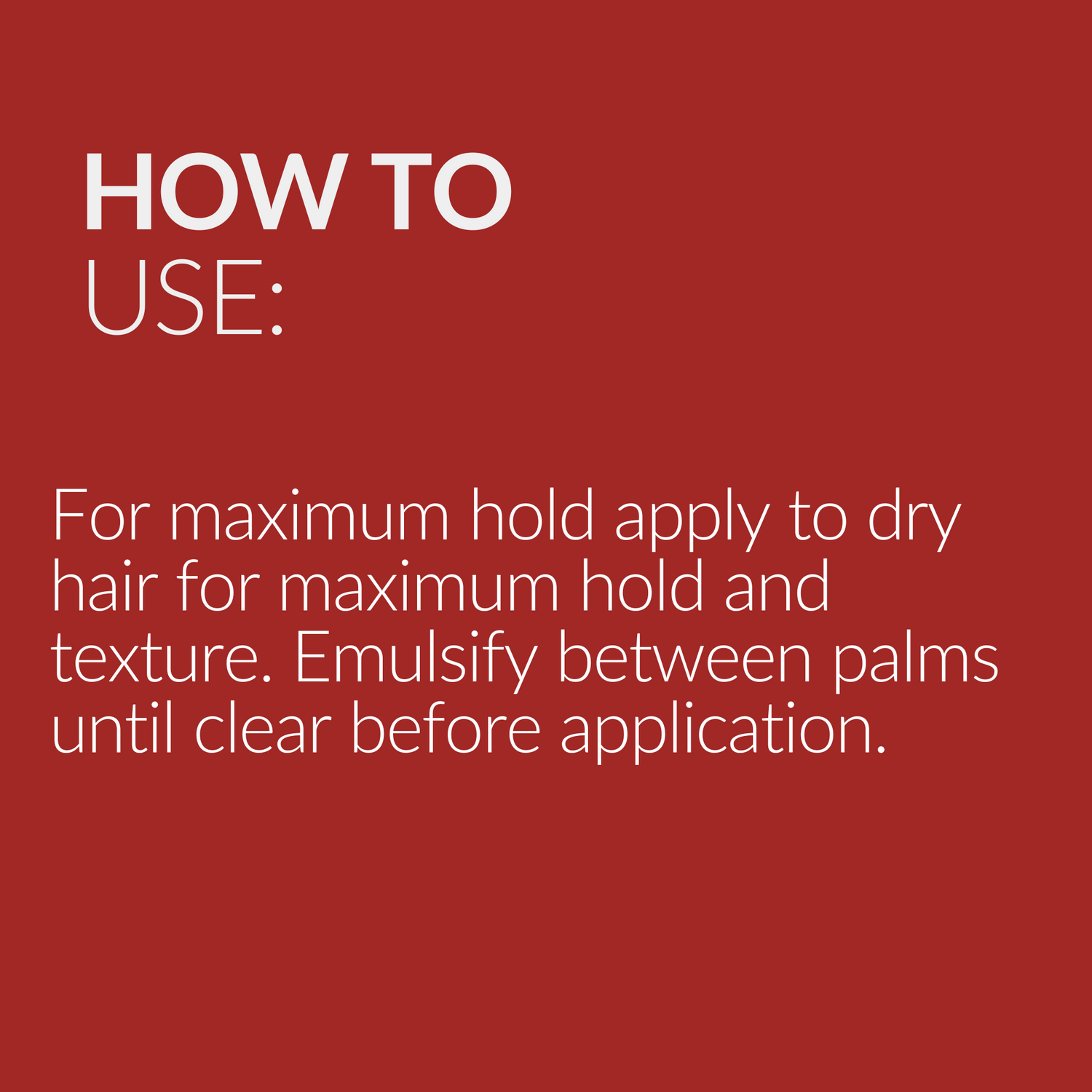 - Apply to completely dry hair to achieve maximum hold, texture and an ultra-low sheen finish.